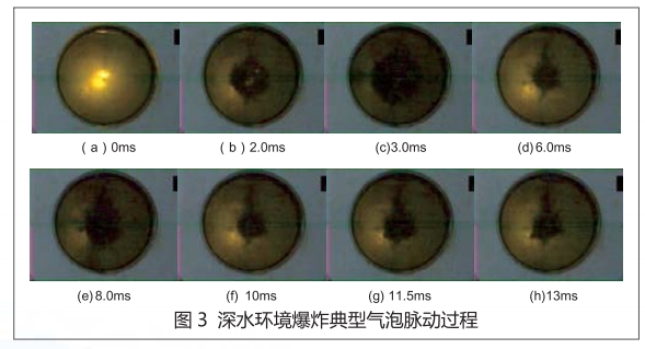 3、研發(fā)了深水爆炸容器多參數爆炸 測試系統,通過(guò)實(shí)驗揭示了不同水深、 不同藥量對深水爆炸沖擊波峰值壓力和 氣泡脈動(dòng)半徑及周期的影響規律,為獲 得不同水深和炸藥當量的爆炸作用規律 及爆破器材性能參數提供了全新的研究