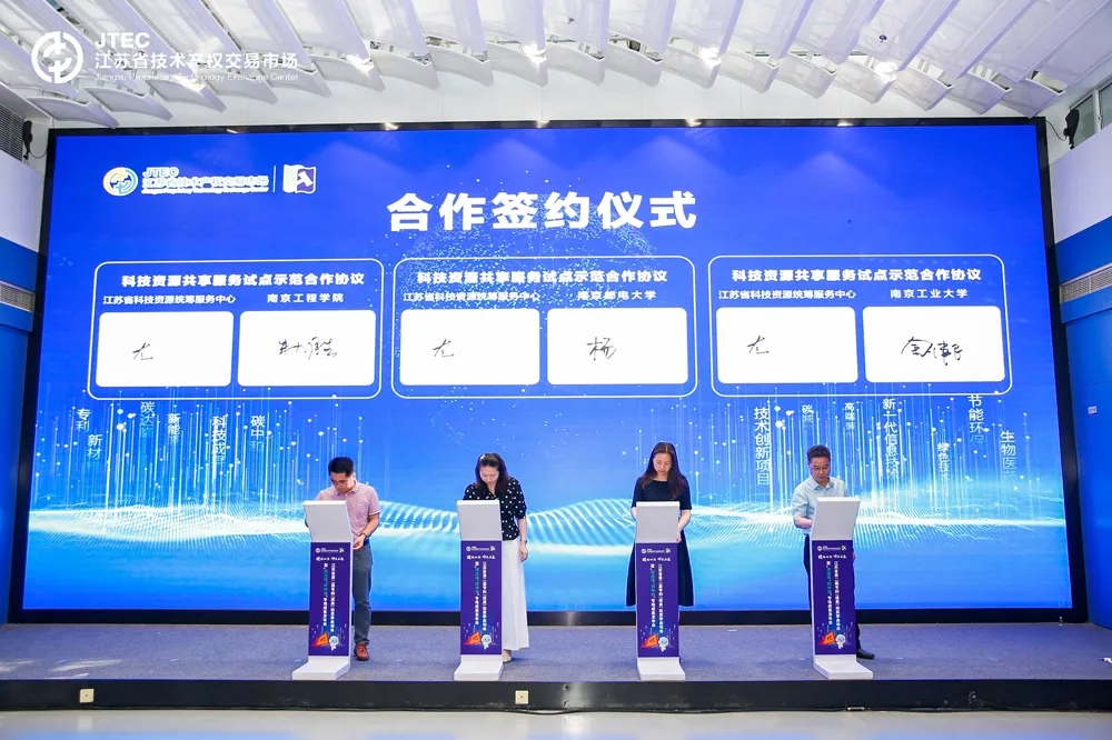 省科技資源統籌服務(wù)中心副主任尤琛輝、南京郵電大學(xué)產(chǎn)學(xué)研合作處處長(cháng)楊靜、南京工業(yè)大學(xué)大學(xué)科技園管理辦公室副主任金偉民、南京工程學(xué)院科技處副處長(cháng)朱大勝上臺簽約