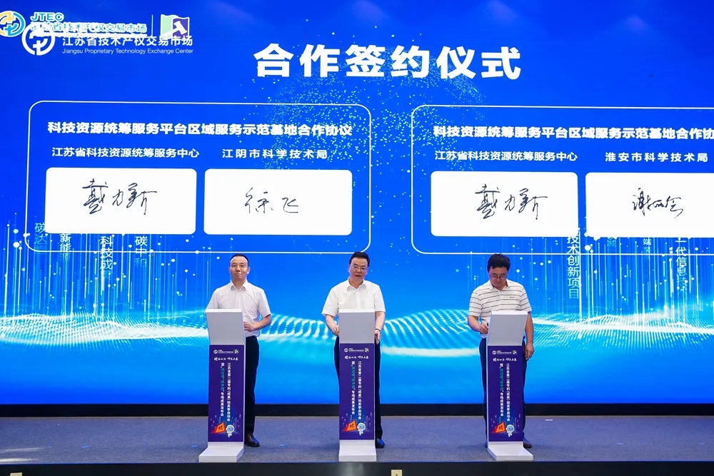 省科技資源統籌服務(wù)中心主任戴力新、淮安市科學(xué)技術(shù)局副局長(cháng)謝筱會(huì )、江陰市科學(xué)技術(shù)局局長(cháng)徐飛上臺簽約