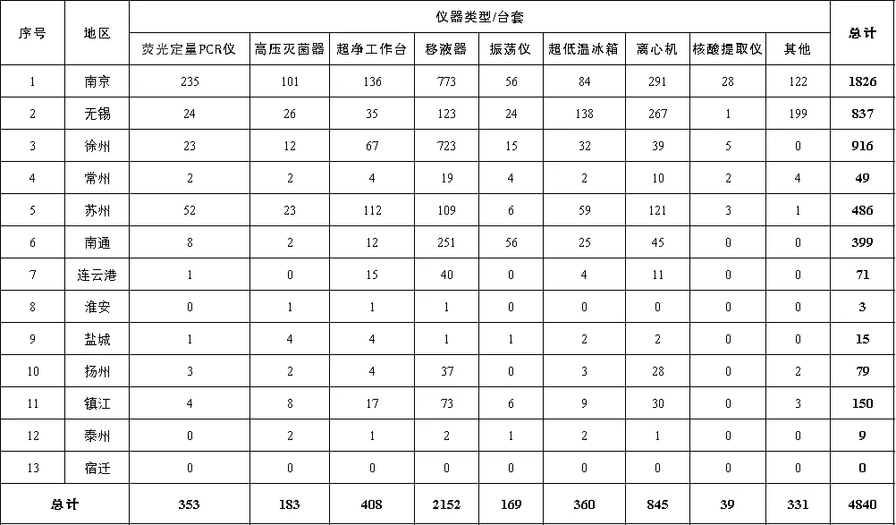 為助力疫情防控,7月27日起省統籌中心緊急啟動(dòng)征集抗擊新冠肺炎疫情所需檢驗檢測儀器設備工作,全省有關(guān)高校院所、專(zhuān)業(yè)服務(wù)機構積極響應,全力支持。截至8月6日,共征集到66家單位的相關(guān)儀器設備4840臺,其中,熒光定量PCR儀353臺、高速離心機845臺、核酸提取儀39臺、振蕩儀/器169臺、高壓滅菌器183臺、 超凈工作臺408臺、移液器2152臺、超低溫冰箱360臺。