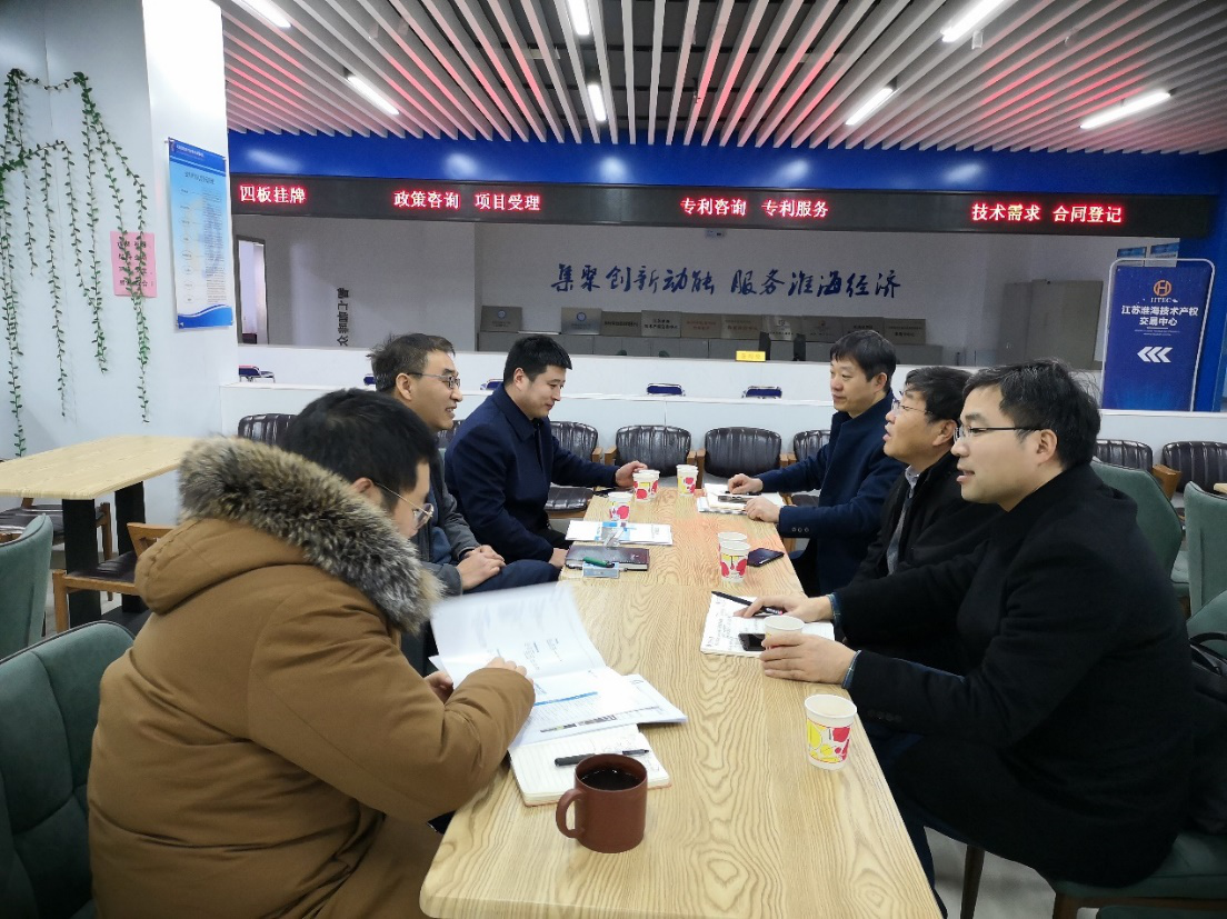 冉院長(cháng)一行先后參觀(guān)了一站式服務(wù)窗口、路演大廳等配套設施,聽(tīng)取了我中心建設和技術(shù)交易工作開(kāi)展情況。隨后,雙方在創(chuàng )客咖啡吧就籌備建立淮海經(jīng)濟區技術(shù)轉移聯(lián)盟、推進(jìn)高??萍汲晒D移轉化和高校人才創(chuàng )新創(chuàng )業(yè)發(fā)展、促進(jìn)區域高新技術(shù)對接合作等方面進(jìn)行了深入探討。各位專(zhuān)家分別介紹了各自學(xué)院優(yōu)勢學(xué)科與科技成果資源,希望與江蘇淮海技術(shù)產(chǎn)權交易中心進(jìn)一步加強聯(lián)系與合作,積極推進(jìn)高校與地方企業(yè)合作,促進(jìn)科技成果在淮海經(jīng)濟區域內的轉化與交易。