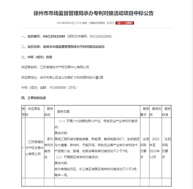 2022年06月23日,江蘇淮海技術(shù)產(chǎn)權交易中心成功中標徐州市市場(chǎng)監督管理局“承辦專(zhuān)利對接活動(dòng)”項目,該項目是圍繞我市“六大”戰略性新興產(chǎn)業(yè)及特色農業(yè)產(chǎn)業(yè)而舉辦的系列專(zhuān)利對接活動(dòng),目的是促進(jìn)優(yōu)質(zhì)專(zhuān)利轉移轉化,服務(wù)我市技術(shù)創(chuàng )新和產(chǎn)業(yè)高質(zhì)量發(fā)展。