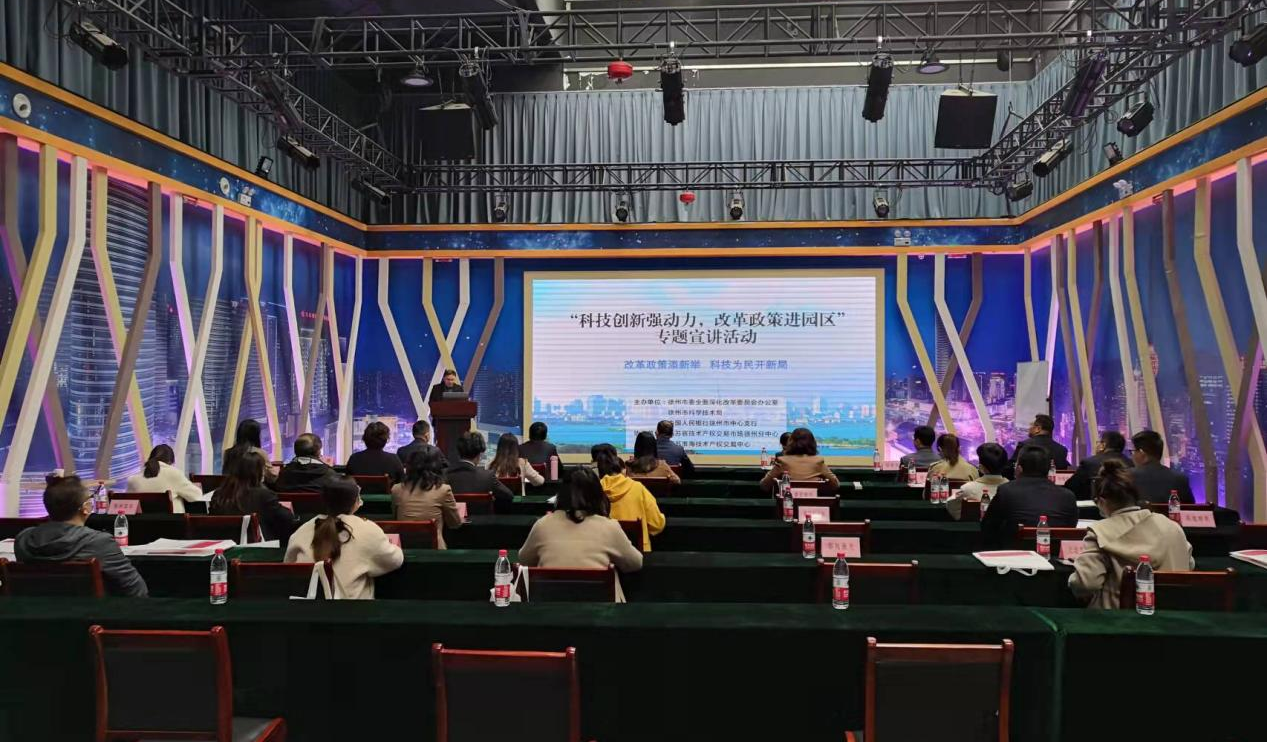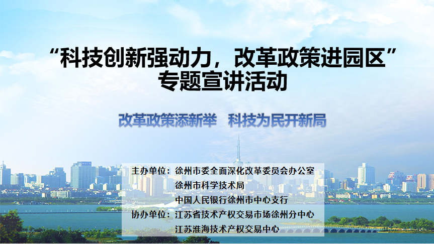 為持續推動(dòng)“科技為民辦實(shí)事”走深走實(shí),進(jìn)一步加大科技創(chuàng )新政策宣傳輔導力度,10月29日下午,由徐州市委改革辦、徐州市科技局、中國人民銀行徐州市中心支行主辦的“科技創(chuàng )新強動(dòng)力,改革政策進(jìn)園區”專(zhuān)題宣講活動(dòng)在江蘇省技術(shù)產(chǎn)權交易市場(chǎng)徐州分中心成功舉行。