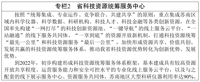 (三)共建科技公共服務(wù)平臺。加快省科技資源統籌服務(wù)中心建設,構建“一站式、全鏈條”的科技資源統籌服務(wù)體系。積極推進(jìn)國家知識產(chǎn)權局專(zhuān)利審查協(xié)作江蘇中心、國家技術(shù)轉移中心蘇南中心、中國(南京、蘇州)知識產(chǎn)權保護中心等跨地區綜合性科技服務(wù)平臺建設,支持江蘇國際知識產(chǎn)權運營(yíng)交易中心等載體市場(chǎng)化運作,進(jìn)一步提升蘇州自主創(chuàng )新廣場(chǎng)、國家知識產(chǎn)權服務(wù)業(yè)集聚發(fā)展示范區(試驗區)、南京麒麟科技創(chuàng )新園等科技服務(wù)示范區建設水平。支持南京、無(wú)錫、蘇州等建設智能測控產(chǎn)品、高端儲能產(chǎn)品、新能源汽車(chē)充電設施等國家質(zhì)檢中心。突出省技術(shù)產(chǎn)權交易市場(chǎng)的示范牽引作用,支持在蘇南自創(chuàng )區布局建設物聯(lián)網(wǎng)、機器人及智能裝備、集成電路、高性能合金材料、智能電網(wǎng)等一批行業(yè)分中心,加快宜興環(huán)科園生態(tài)環(huán)境大數據診療平臺、南京檢驗檢測服務(wù)業(yè)集聚區等建設。鼓勵蘇南五市引導行業(yè)龍頭企業(yè)牽頭建設一批跨區域的產(chǎn)業(yè)技術(shù)創(chuàng )新戰略聯(lián)盟,加快貫通產(chǎn)業(yè)上下游的科技服務(wù)鏈條。加快建立完善標準化服務(wù)體系,加大對重大、關(guān)鍵核心技術(shù)標準的支持和服務(wù)力度,以標準促進(jìn)關(guān)鍵核心技術(shù)產(chǎn)業(yè)化、市場(chǎng)化。到2022年,蘇南地區技術(shù)市場(chǎng)合同成交額達1350億元。
