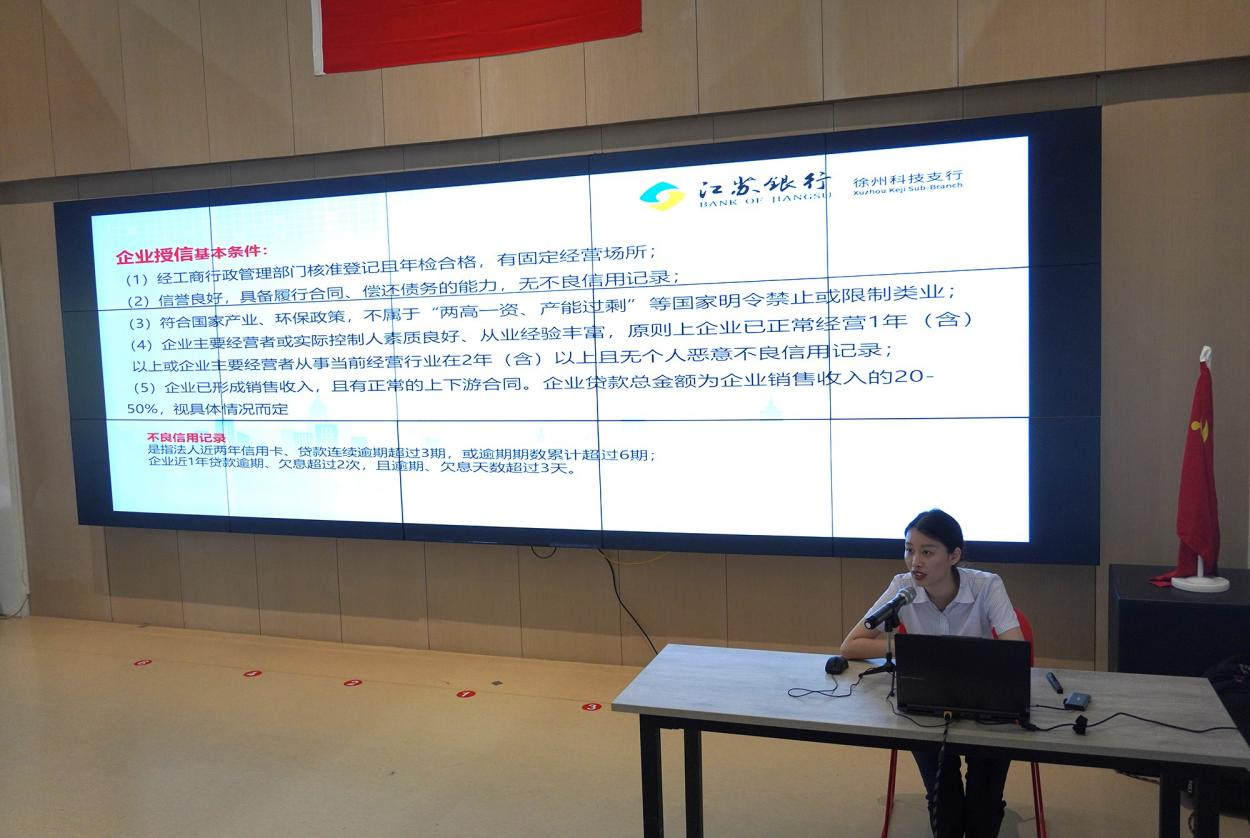 江蘇銀行徐州科技支行小微業(yè)務(wù)部主任周思圍繞科技小微創(chuàng )業(yè)企業(yè)融資難的“痛點(diǎn)”開(kāi)展特色金融服務(wù)推介,并圍繞科技小微創(chuàng )業(yè)企業(yè)固定資產(chǎn)少、科技含量高等特點(diǎn),重點(diǎn)推介了蘇科貸、小微貸、人才貸、高企貸、蘇質(zhì)貸、專(zhuān)精特新貸等特色金融產(chǎn)品。